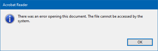 To make matters worse, none of the files synced to OneDrive now open; I am using OneDrive to backup Desktop, Documents, and Pictures, so none of those files can be opened... Here is an example of a message thrown when trying to open a PDF on my Desktop (which, by the way, is fully sync'ed, as indicated by the green check overlay on the file's icon):