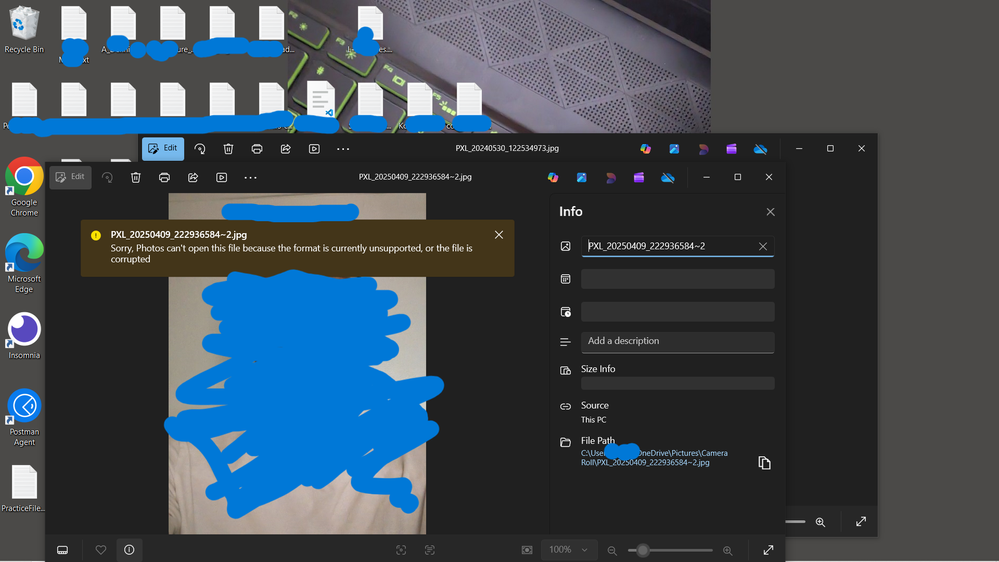 Photos app opens images sometimes without all of the file info, and displays this error message.