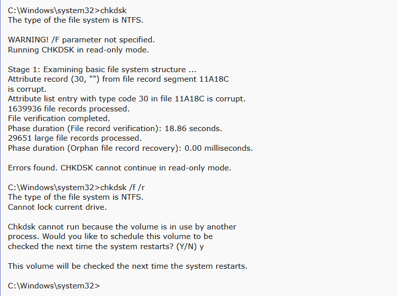 Hey guys, I've been experiencing some odd blue screens in the past month that I can't exactly remember the codes for, but have lead me to sort of double take and take a look across my entire machine. In trying out the Windows Memory Diagnostic tool, I was told I had some hardware issues but nothing explicit was.. said? I do know one blue screen was a ram error but I was playing quite a few games with memory leaks at the time so i payed it not.. much mind. I moved on to a ran as admin command window and did the usual chkdsk and this is what I have currently, not really sure how to proceed. Any Ideas?