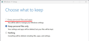 Hi everyone, I'm trying to upgrade my PC to Windows 11, but during the setup process, the Keep personal files and apps is greyed out when upgrading Windows . I don't lost any file and apps during W...