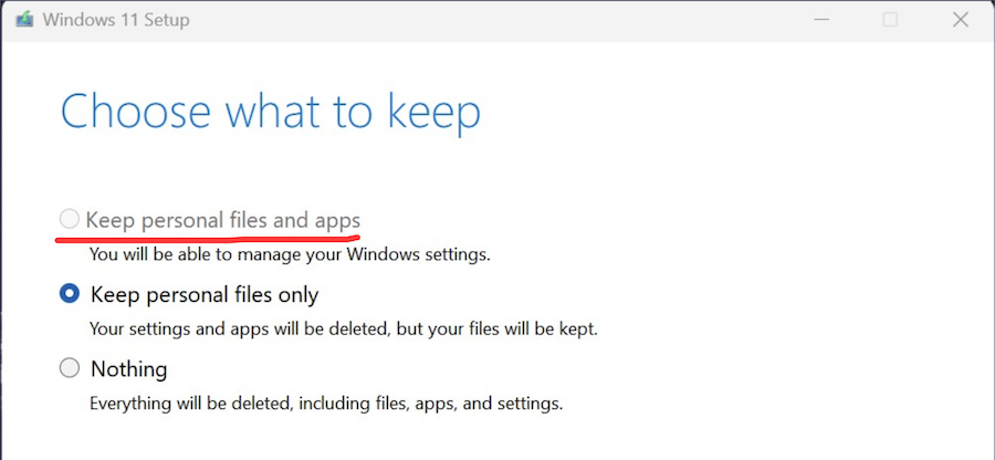 I'm trying to upgrade my PC to Windows 11, but during the setup process, the Keep personal files and apps is greyed out when upgrading Windows . I don't lost any file and apps during Windows 11 upgrade.