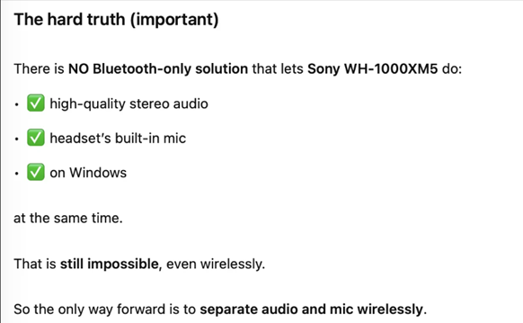 On the Windows 10 system, when using Bluetooth headphones such as Sony WH-1000XM5 or AirPods, it is not possible to simultaneously enable the microphone while maintaining high-quality stereo audio mode. The same headphones function properly on macOS, but no solution has been found yet on Windows. I want to confirm whether this is an inherent technical limitation of the Windows system or if there are specific overlooked settings that can resolve this issue.