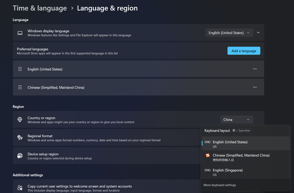 What’s strange is that English (Singapore) doesn’t show up under Settings → Time & Language → Language & Region. My usual workaround is to manually add English (Singapore) there, then remove it right away. That makes it disappear from the taskbar and everything works fine… until I restart the laptop, and the whole thing repeats.