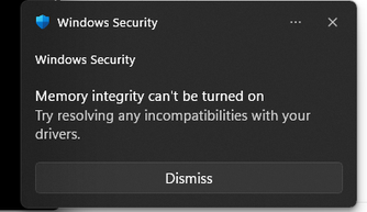 When I try to enable memory integrity I get the message shown below.