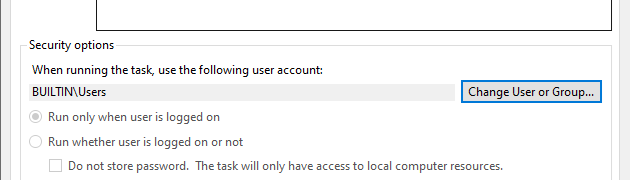 - Under Security options, select Run whether user is logged on or not.