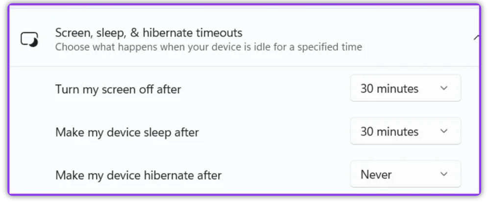 Here's my Screen, sleep, & hibernate timeout settings. When this