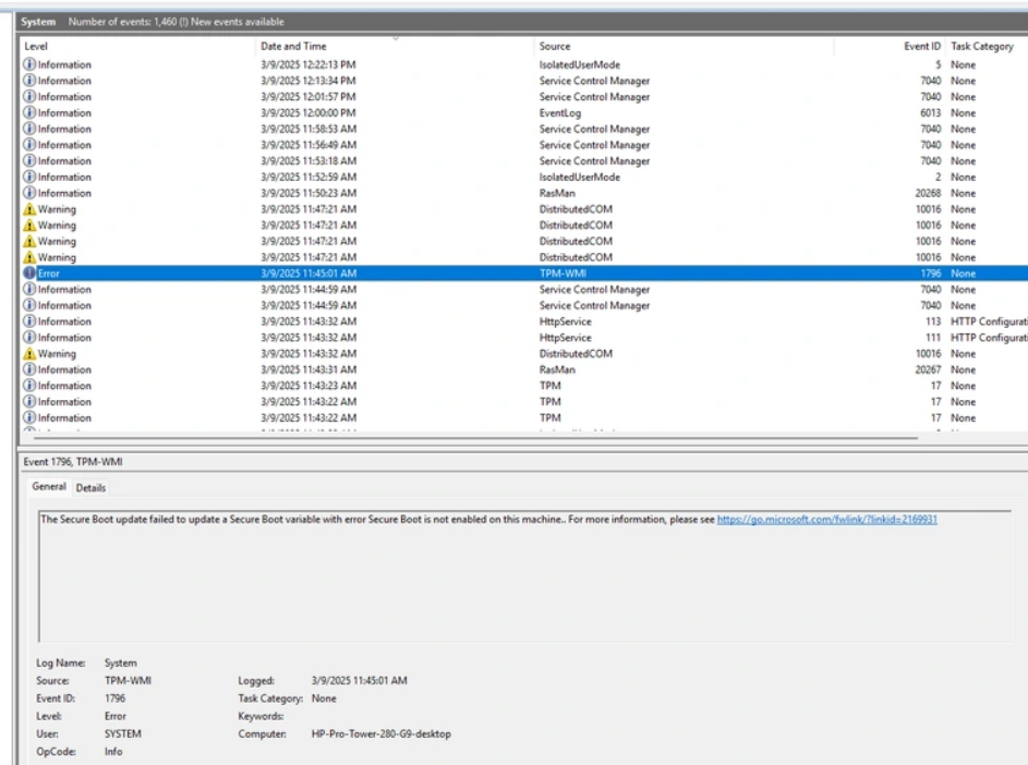 The Event ID 1796 TPM-WMI error in the Event Viewer is often related to issues with Secure Boot updates. This error typically occurs when the Secure Boot update fails to update a Secure Boot variable, which might be due to Secure Boot being disabled or other system-related glitches.