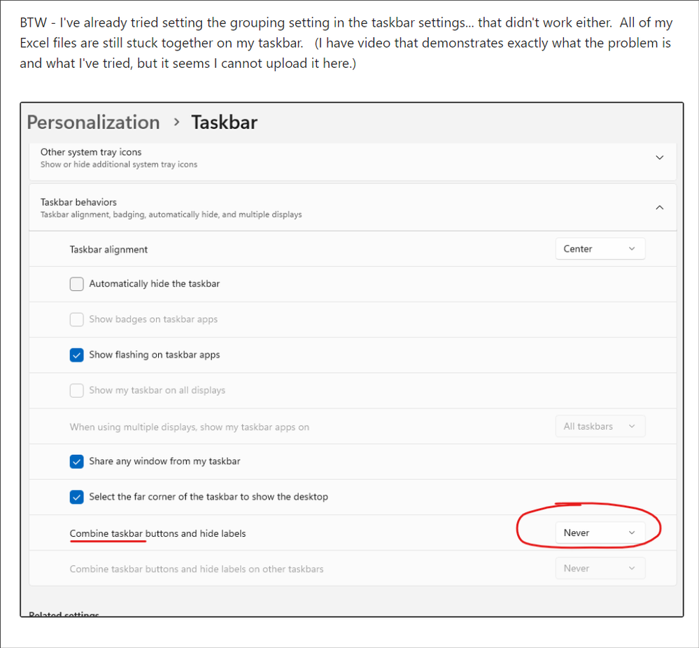 BTW - I've already tried setting the grouping setting in the taskbar settings... that didn't work either. All of my Excel files are still stuck together on my taskbar. (I have video that demonstrates exactly what the problem is and what I've tried, but it seems I cannot upload it here.)