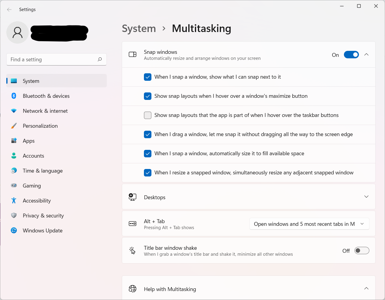 There is a checkbox for the option: "Show snap layouts that the app is part of when I hover over the taskbar buttons"