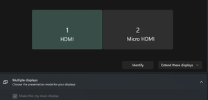 I use a Dual monitor, both with HDMI outputs, connected with an HDMI and a Micro HDMI cable. HDMI is the 1st main connection and micro HDMI is the secondary connection, i.e. the 2nd monitor. But Wind...