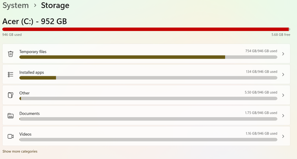 I am having problems with my acer aspire 5. I have very limited disk space and it says 700+gb are taken by temporary files: