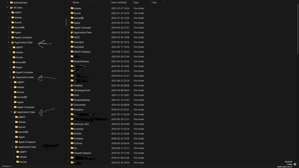 When I open "Application data" directory there are a bunch of folders for various applications, as expected BUT another "Application Data" directory. What is in the top level Application Data is in the this next level down Application Data directory too and in the one below...