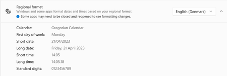 In my opinion the Windows 10 Regional Format for "English(Denmark)" is correct, but unfortunately in Windows 11 it is wrong: Windows 11 (Wrong) Windows 10 (Correct😞 Note the ...