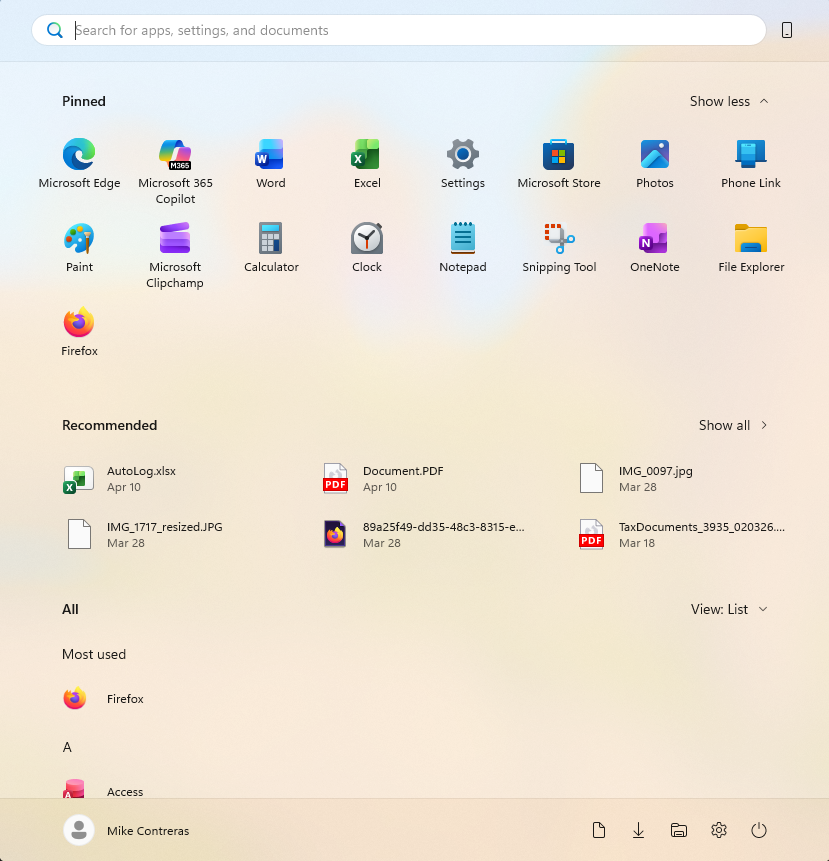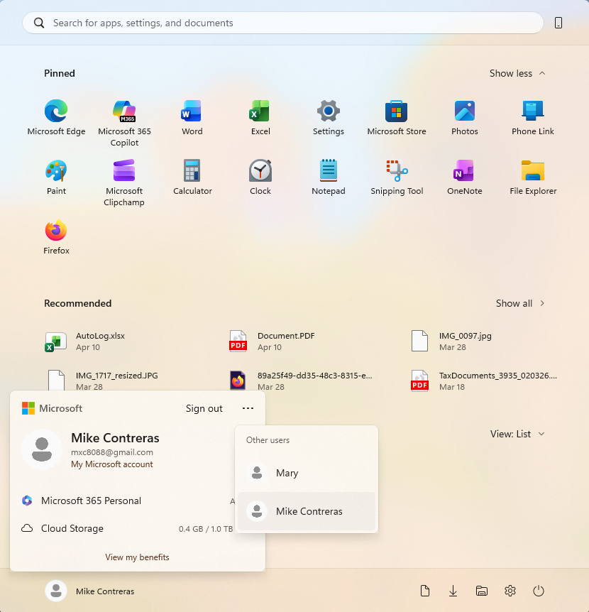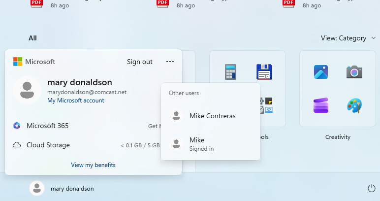 Signed in as Mike (User) but the Start Menu displays Mike Contreras (the Admin account)