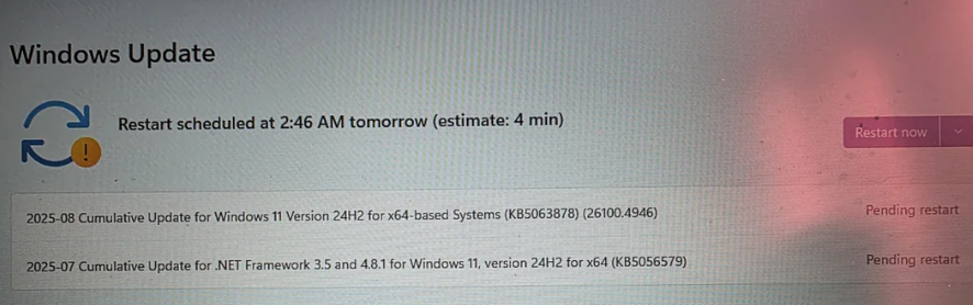 Apologies, I bet there have been a lot of posts about this update since I've seen a lot of talk about it on other sites. Also, there are a lot of Windows related subreddits and I'm not entirely sure which is the best one to post to so please let me know if there's a better one and I'll go there <3 I am very tech dumb so please bare with me. The above in the picture are both shown as pending on my laptop. There have been a lot people saying to uninstall update KB5063878. Does this mean I have to download it in order to uninstall it and get it off my computer or can I do something about it while it's pending. Also, what's the second one that's pending--the KB5056579. Is that safe? Please help my poor tech dumb soul :') thank you so much <3
