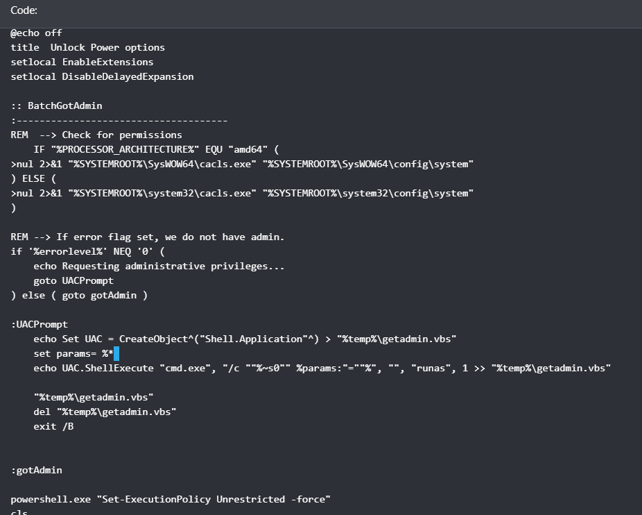 - Save the file with a .bat extension, e.g., UnlockPowerOptions.bat.
