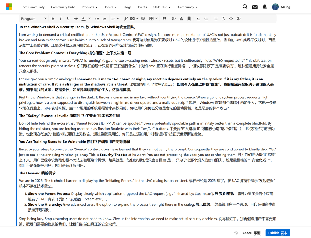 I am writing to demand a critical rectification in the User Account Control (UAC) design. The current implementation of UAC is not just outdated; it is fundamentally broken and fosters dangerous user habits due to a lack of transparency.