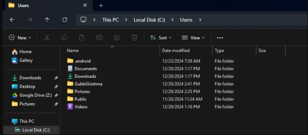 There should not be .android, Documents, Downloads, Pictures, Public Or Videos Folders for the "Users" directory. Those folders would be inside of a Users folder which would be in that directory.