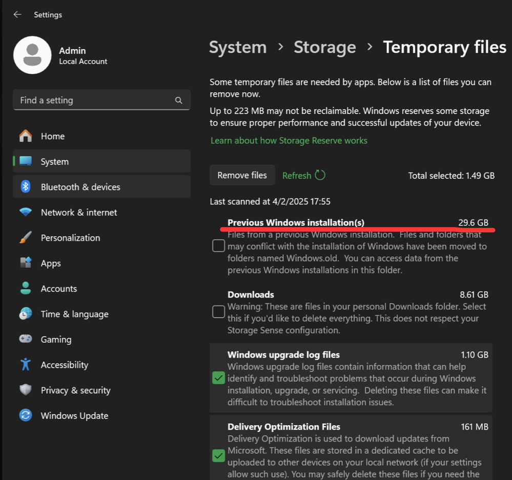 The old Windows install file (Windows.old) stores your previous system version for recovery. If you don’t need to roll back, it’s safe to delete and can free up a lot of space!
