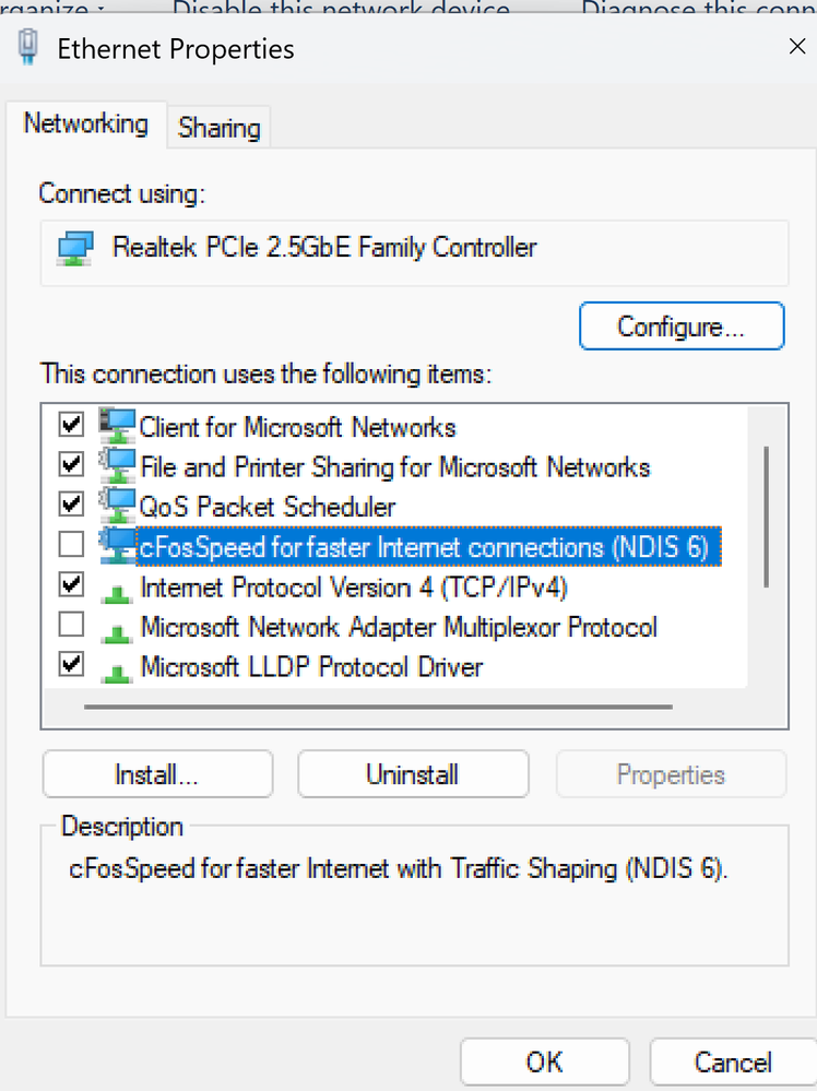 If you go to network and internet in control panel, then network connections, right click the appropriate connection and go to properties... The highlighted row was causing my issue.  I'm uninstalling it but wanted to post this here first, before we had a denvercoder9 situation.
