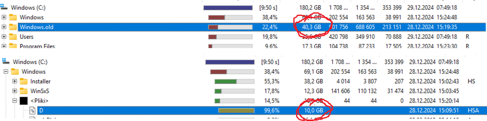 The biggest offenders are the Windows.old folder (40GB) and this mysterious file in C:\Windows folder with a name "D" (10 GB):