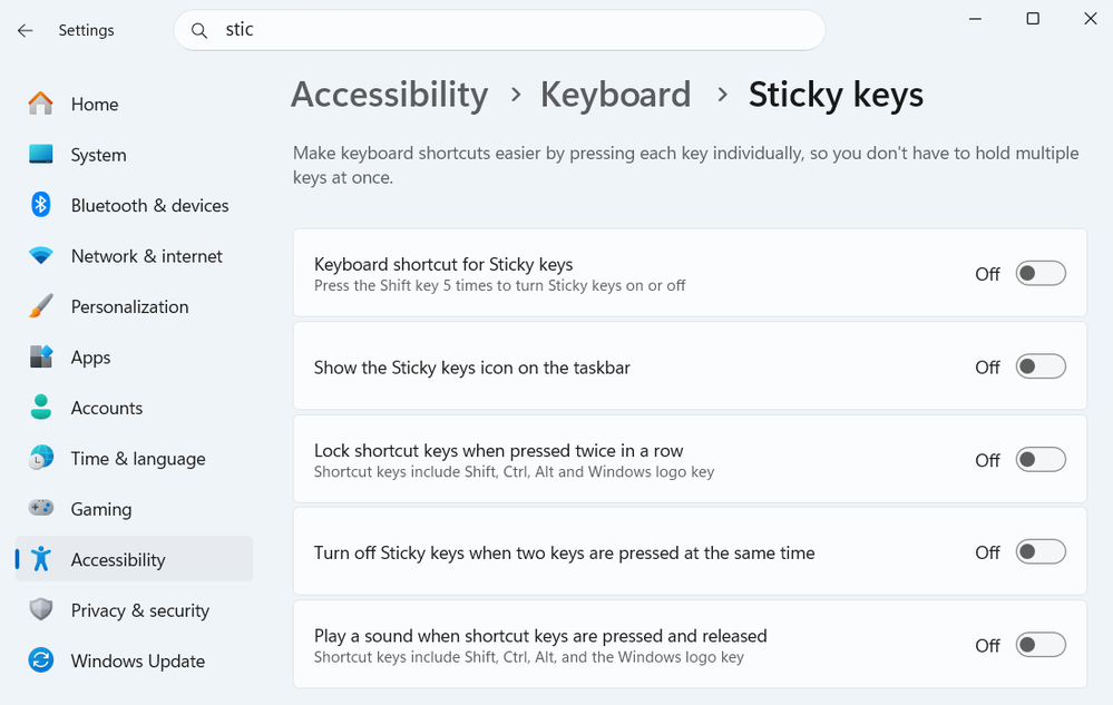 Switch off "Sticky Keys" in Windows 11 accessibility settings: