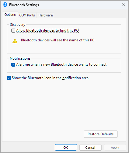 - Expect to be able to use an Enter key on your keyboard to enable the "Allow Bluetooth devices to find this PC" checkbox in Bluetooth Settings (shown below):