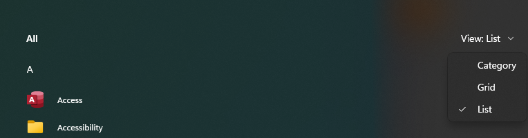 However, I do occasionally wish I could access All apps more easily from the keyboard. A shortcut (kind of..) I found is to hit the Windows keyy and then the Tab key twice to navigate to the All apps button, and then hit the Space or Enter key to select All apps. So just three extra quick keystrokes.- RBACopper Contributor