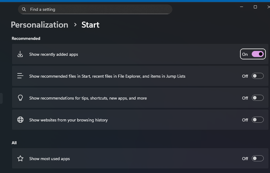 For me the easiest method was installing Windhawk with the "Show all apps by default in start menu" Mod. Boom, done. I also use that app to be able to re-arrange taskbar thumbnails (Taskbar Thumbnail Reorder).- markholleyCopper Contributor