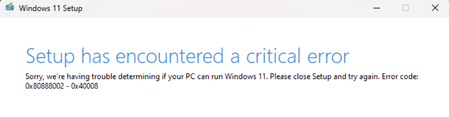 Is there a way to fix this error when I was trying to upgrade my laptop from Windows 10 to Windows 11, it says: Windows 11 Setup Setup has encountered a critical error Sorry, we're having trouble...