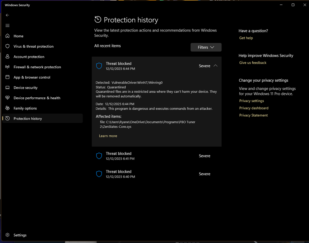 I was using PBO Tuner to fine tune my processor yesterday and now Windows Defender blocked it for no reason and its not letting me restore the file.If anybody can help me with this i would appreciate it.