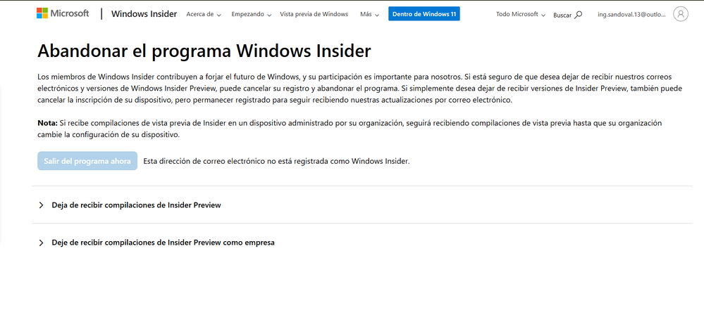 Tengo la duda de saber el cómo salir del programa de Windows Insider, ya que desde la configuración, me dirige a paginas donde me dicen lo mismo que ya hice para buscar darme de baja del programa, además que me señala que la cuneta no es la que está registrada. Caray, pues no es que tenga mil cuentas de Microsoft. Solo tengo una...😠