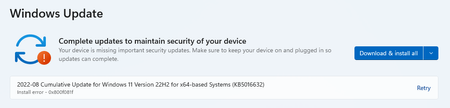 2022-08 Cumulative Update for Windows 11 Version 22H2 for x64-based Systems (KB5016632) Installerror