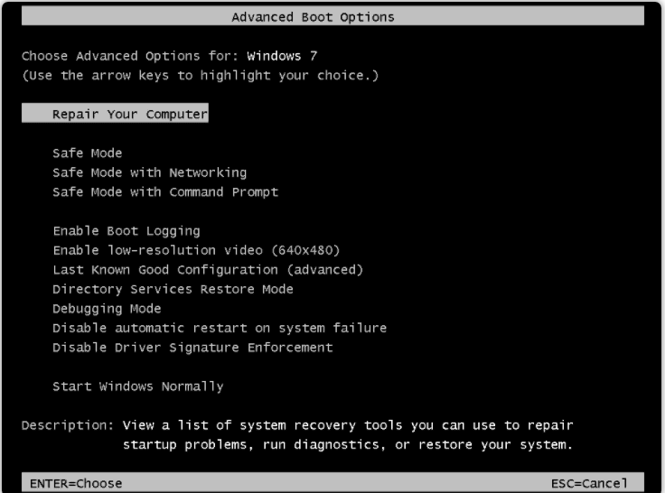 Doesn't that menu not only show up when there's an error in startup? Have you tried to select the Repair Your Computer -option?