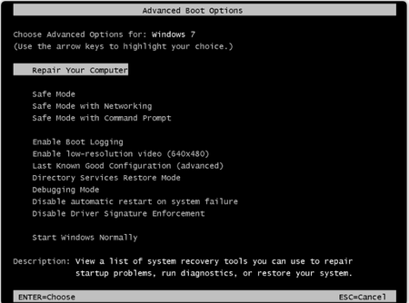Doesn't that menu not only show up when there's an error in startup? Have you tried to select the Repair Your Computer -option?
