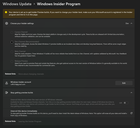 Hello, I am currently in the Dev Build for Windows 11 Insider (last update Windows 11 Insider Preview 23451.1000 (ni_prerelease)). I am trying to leave Windows Insider but I cannot switch my Insi...