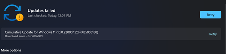getting error while updating - version Windows 11 (10.0.22000.120) (KB5005188) Download Error- 0xca00a009 , anyone have fix?