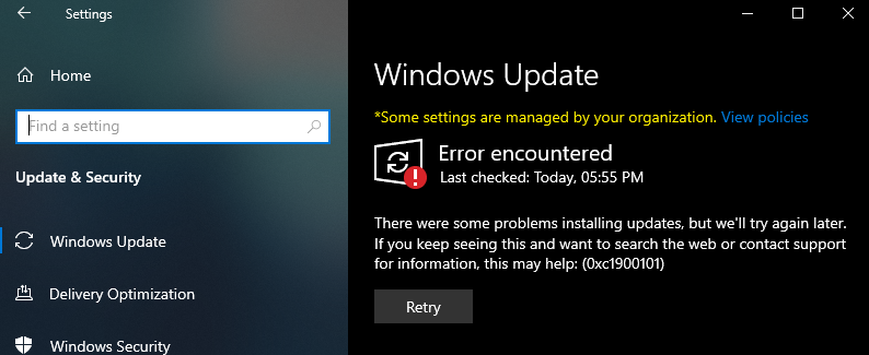 - A new build 21322 was showing, I downloaded, installed 100%, rebooted, showed the same error as earlier 0xc1900101.