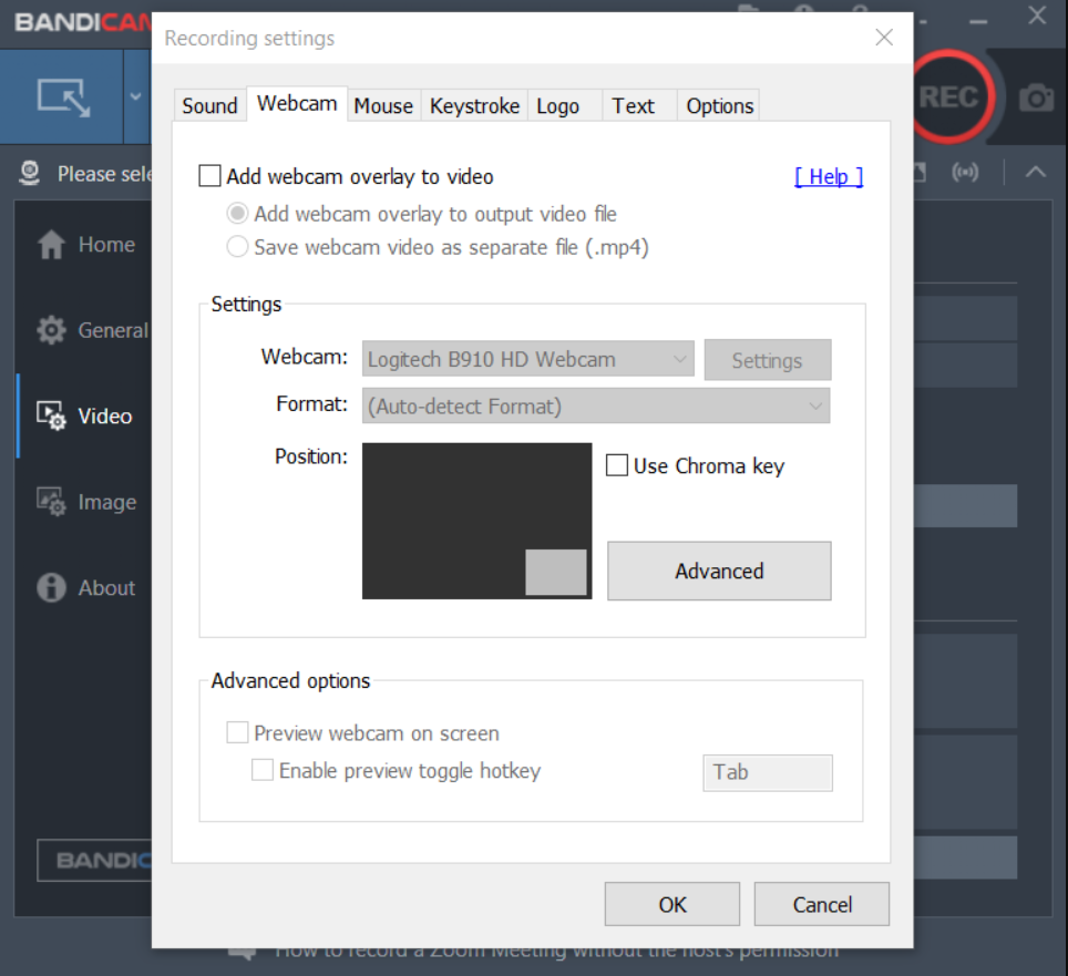 Make sure Bandicam has permission to access the camera (Windows Settings > Privacy > Camera).