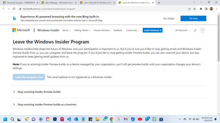 I am clicking an leave insider program but it's shows an your email address is not registered in insider program. And ,I am not unable to change the insider setting? I am sharing an screenshot o...