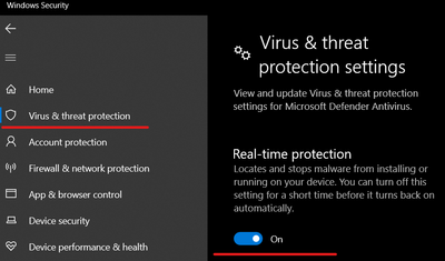 Microsoft Windows Defender App - Virus & Threat Protection - Manage Settings - Turn off Real-Time Protection