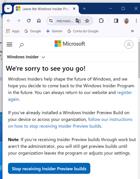 Goodmorning Windows insider team, I want to get out of windows insider, I have the option here with the correct email that was connected however, it is not working, is there other way^ Bom dia eq...
