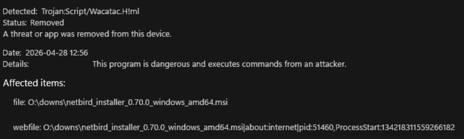 HarrisonteCopper ContributorApr 28, 2026"netbird_installer_0.70.0_windows_amd64.msi" got flagged as a threat by Windows built-in antivirusAnyone else getting this?
