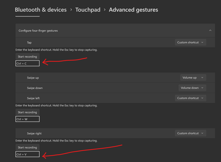 Dear All, I set up four-finger gesture as below: -Four-finger tap: Copy (Ctr+c) -Four-finger swipe right: Paste (Ctr+v) I open File Explorer to test these four-finger gestures and see that man...