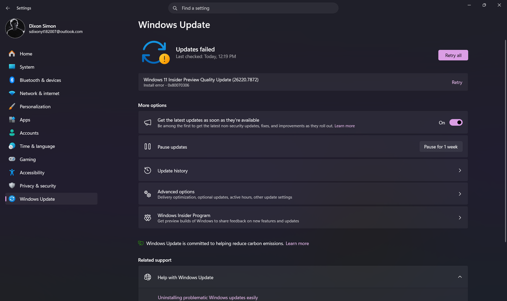 I am unable to install the Windows Insider Preview update for the beta channel and I do not know how to fix it. I have retried around 5 or 6 times and still same error persists,