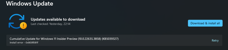 Hey everyone My update is failing to install for some reason. The following update is this: Cumulative Update for Windows 11 Insider Preview (10.0.22635.3858) (KB5039327) and the error is this: ...