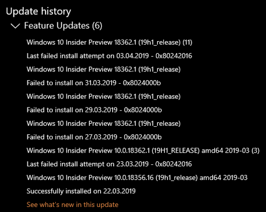 Upgrade from 18356.16 to 18362.1 fails