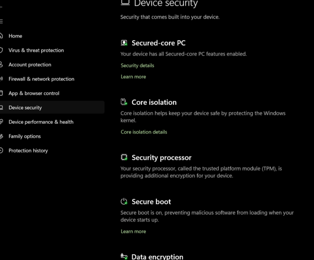 I want a brief explanation of the Secured-core PC feature in Windows Security. What does it do and what security does it provide?