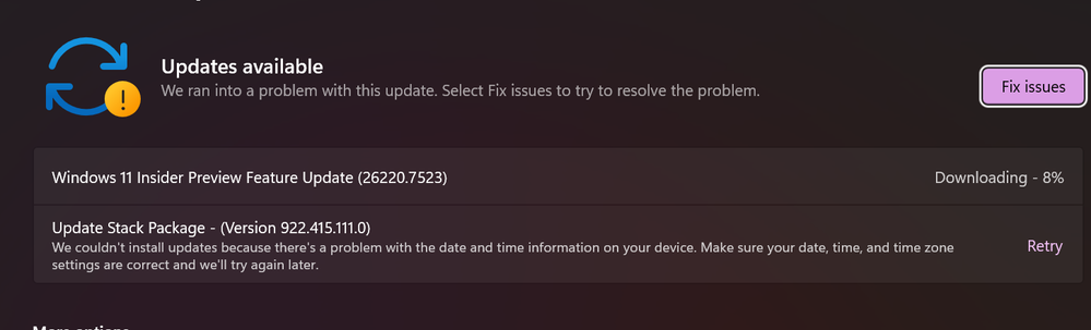 I am experiencing an issue while trying to install a Windows 11 Insider Preview update on my device. The Windows 11 Insider Preview Feature Update version 26220.7523 gets stuck during download and the Update Stack Package version 922.415.111.0 fails to install. The error message shown says: We couldn't install updates because there's a problem with the date and time information on your device. Make sure your date, time, and time zone settings are correct and we'll try again later. I have already verified that the date and time are correct, the correct time zone is selected, and automatic date and time synchronization is enabled. Despite this, the update continues to fail with the same error. This update is important for system stability and Insider testing, so I kindly request a Microsoft moderator or an experienced community member to review this issue and provide guidance as soon as possible.