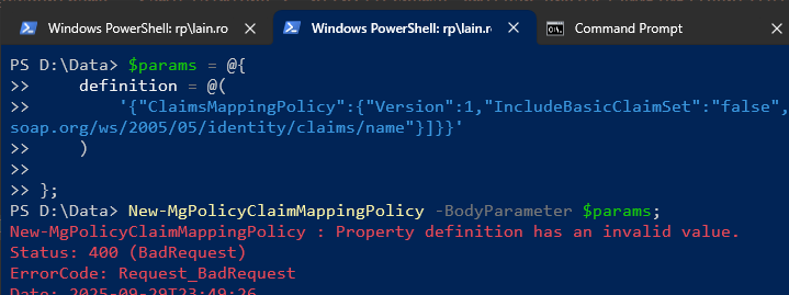 I am attempting to create a Claims Mapping Policy using PowerShell, Entra ID and Microsoft Graph via a script or a PowerShell Window, In neither case, I was able to do it.